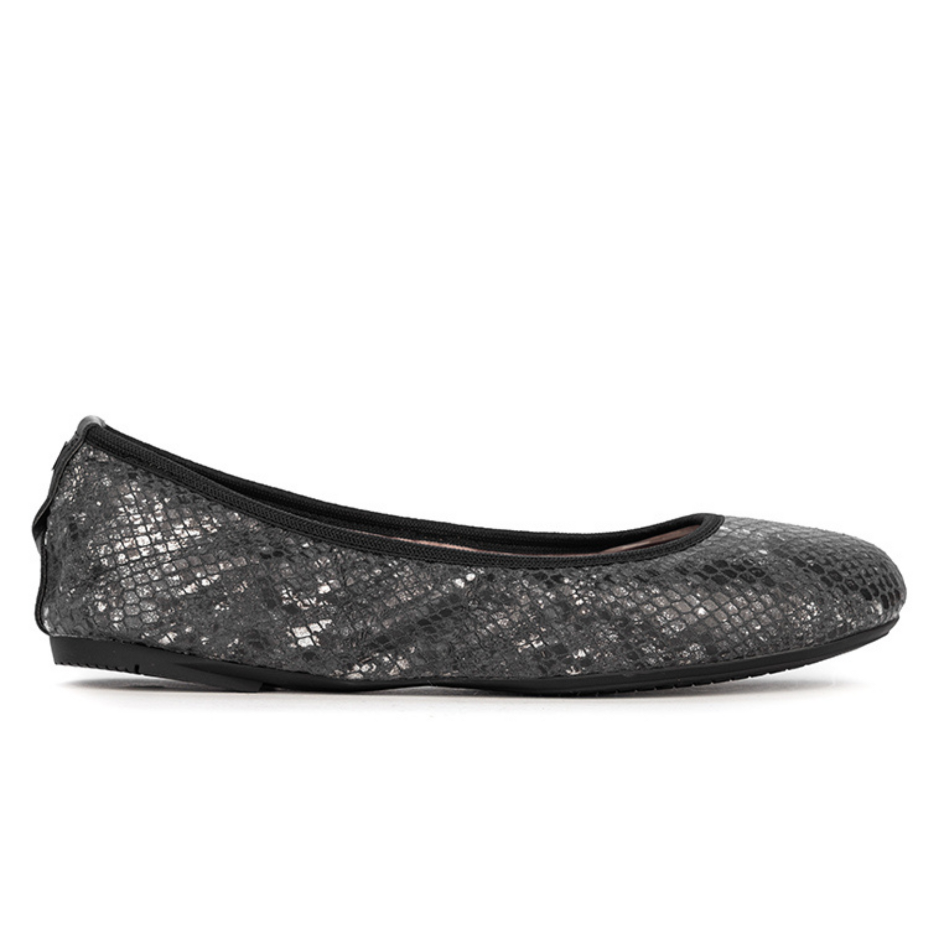 SOPHIA BLACK SNAKE, These ballerina flats are typically crafted from a material designed to mimic the appearance of cobra or snake scales. The black snake texture adds a bold and exotic element to the shoes.